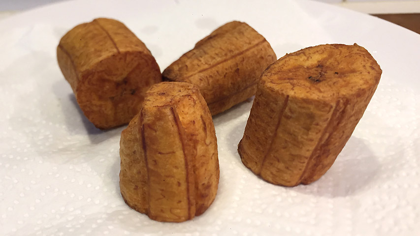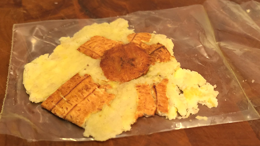 Aplasta los trozos de plátano que ya estarán blanditos y vuelve a freírlos para que tomen color. Bastará con un minuto escaso. Sácalos a papel absorbente.