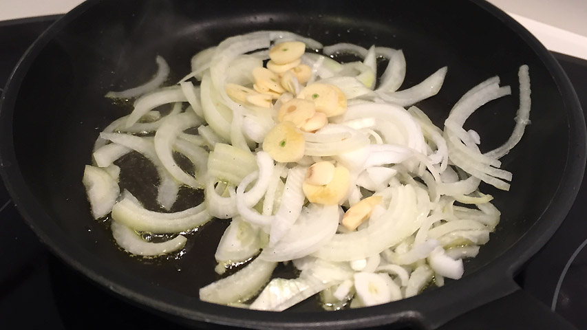 Pon una sartén a fuego medio alto (7/19) con un poco de aceite de oliva y sofríe la cebolla y el ajo sazonados hasta que se hagan. Saca a un plato y reserva.