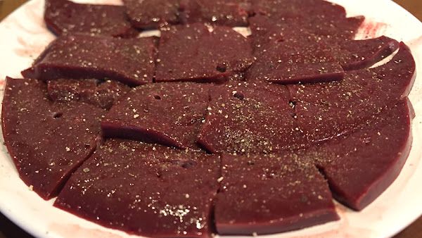 Corta los filetes de hígado en trozos y sazónalos abundantemente con sal de ajo y pimienta negra molida por ambas caras.