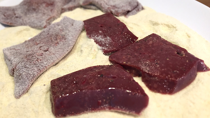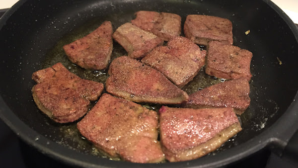 Los filetes de hígado enharinados se fríen en un poco de aceite de oliva en un par de minutos por cada lado.