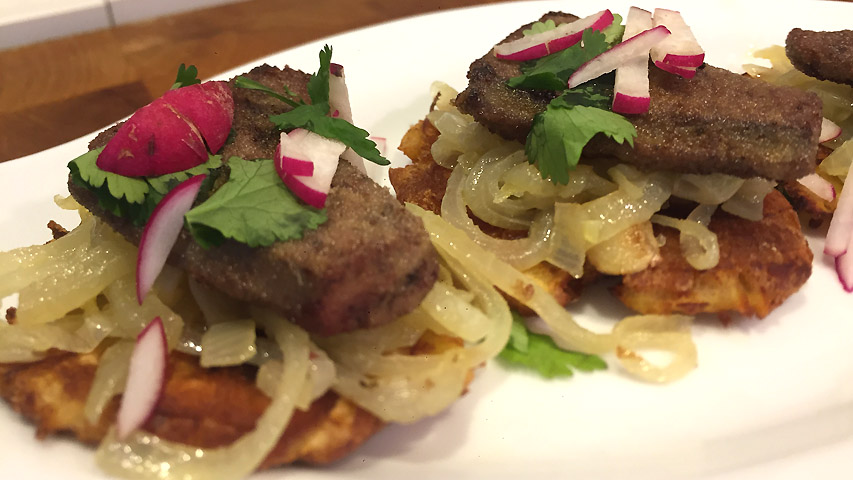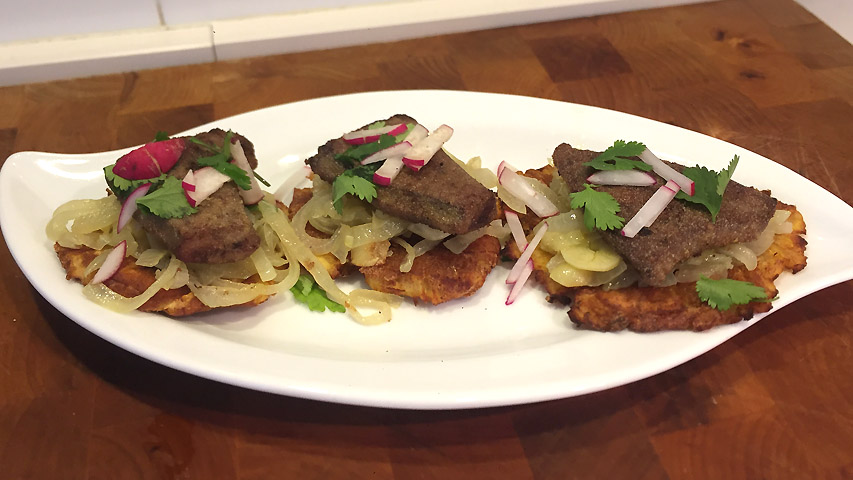 Monta los pinchos poniendo los patacones en un plato, sobre ellos un poco de cebolla y sobre esta un trozo de hígado.