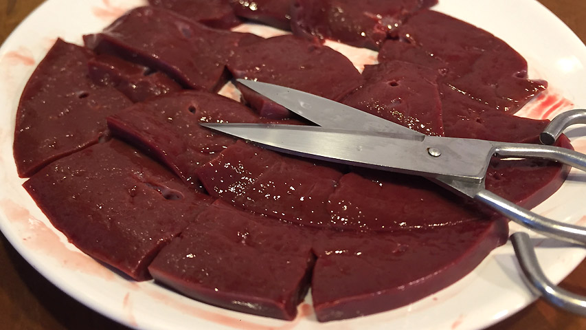 Corto en trozos de bocado los filetes de hígado de ternera que me ha preparado el carnicero.