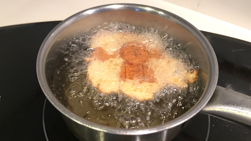 Fríe durante 10 minutos los trozos de plátano en abundante aceite de girasol (que queden sumergidos) a una temperatura no demasiado alta, que el plátano se fría pero poco a poco.