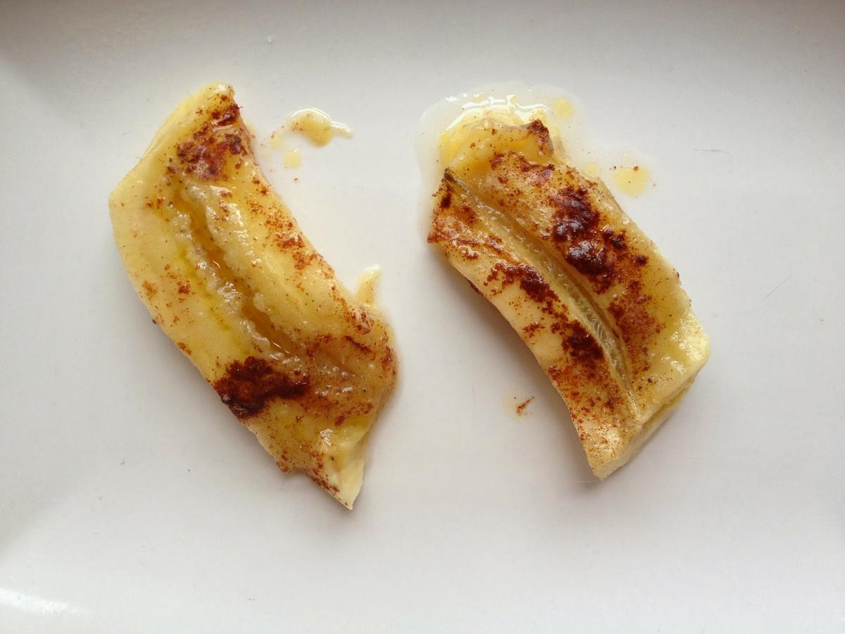 3 Lo metemos al microondas 1 minuto, lo justo para que se derrita la mantequilla ( cada microondas es diferentes, si os pasáis de tiempo,veréis que el plátano se convierte en papilla, os lo digo por experiencia... es decir ,la foto es del 2º plátano que tuve que preparar ... jajaja ¡¡ )