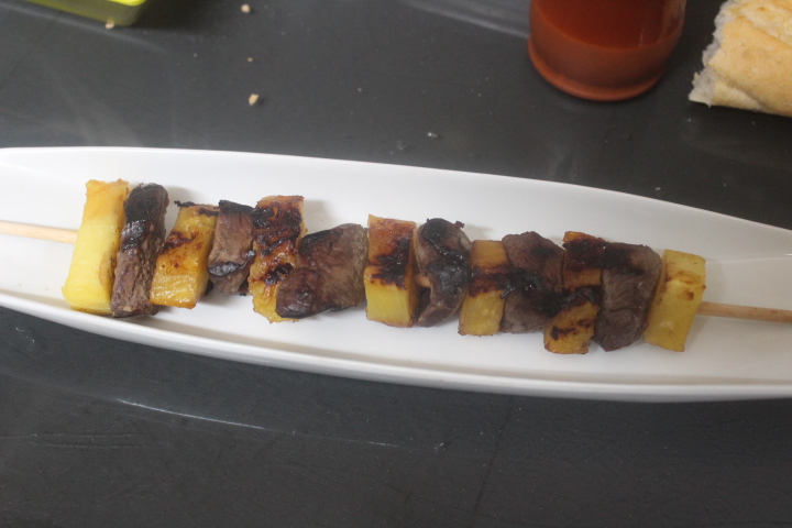 Total, que hubo que inventar una salida, por lo cual opté por cortar daditos de piña natural del tamaño aproximado de los daditos de carne, insertarlos alternadamente en dos brochetas, sazonar e introducir en el grill doble.