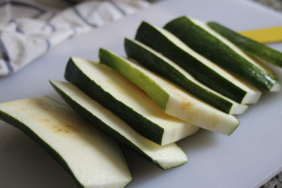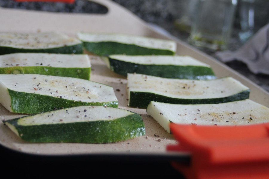 1) cortar un calabacin en mitades no mayor a 1 cm de ancho, poner a cocinar a fuego lento hasta estén dorados.