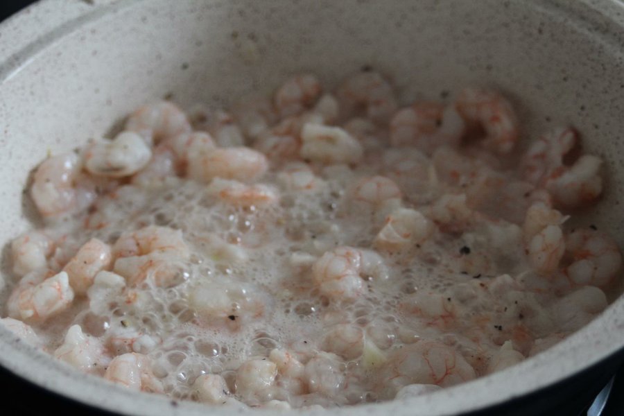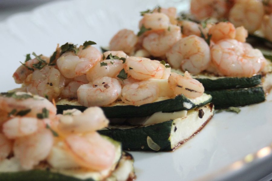 3) intercalar el queso con el calabacin y colocar las gambas sobre el queso formando una torre.