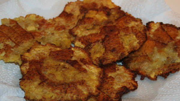 Aplasta cada trozo de plátano macho para hacer una especie de tortilla (patacón). Fríe cada patacón otros 10 minutos. Sácala a papel absorbente.