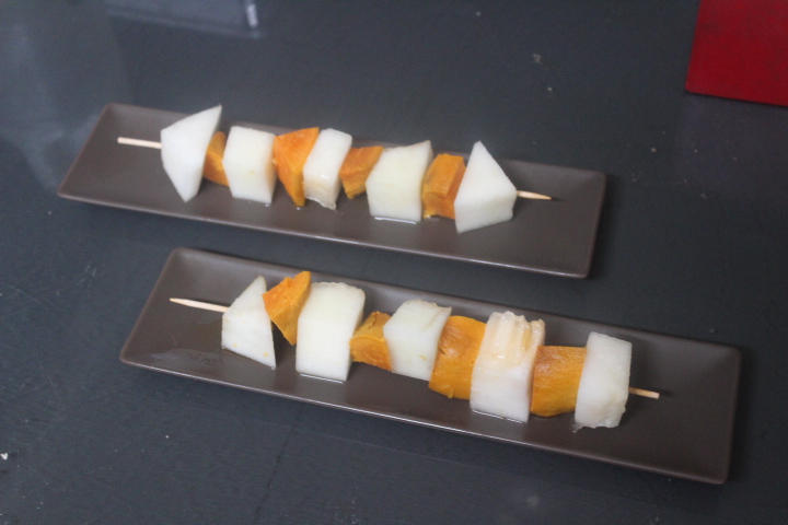 Insertamos alternadamente trozos de melón y boniato en dos palos de brocheta hasta terminar todos los daditos que habéis realizado.