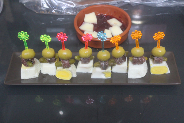Insertamos una aceituna en cada palillo, a continuación colocamos el pepinillo con el lomo de anchoa en el palillo y culminamos nuestro pincho pinchándolo en nuestro dadito de huevo duro.