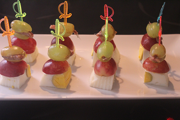Insertamos la uva blanca con su mitad de anchoa en un palillo, a continuación media uva roja y pinchamos sobre el cuadradito de huevo cocido.