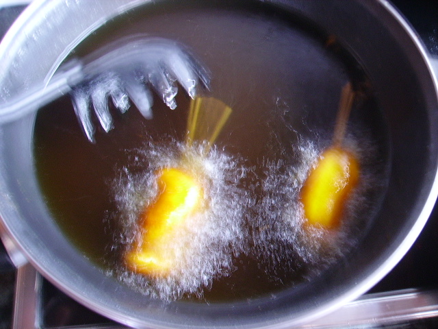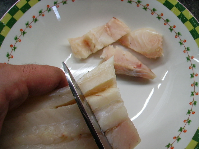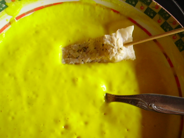 4.- Vamos pasando los trozos de pescado por la masa y los freímos en abundante aceite caliente.