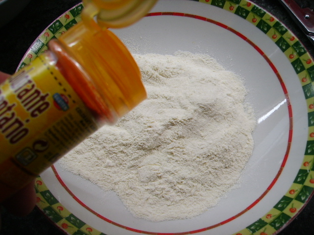 3.- Mientras preparamos el rebozado mezclando la harina, con el gasificante, el colorante y añadimos leche hasta obtener una pasta densa y homogénea.