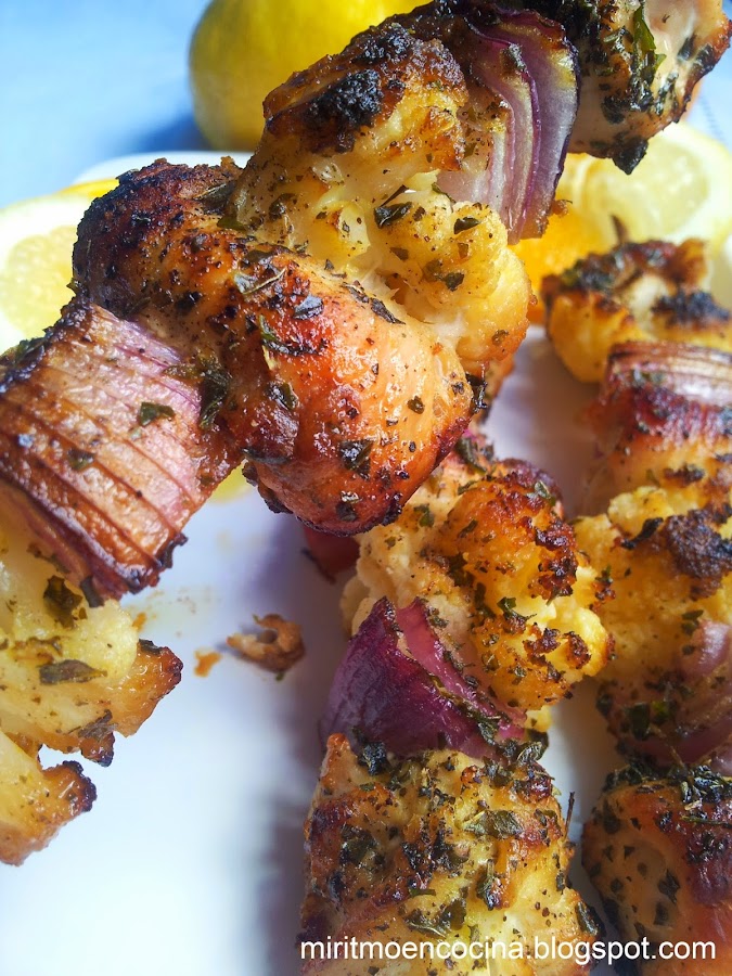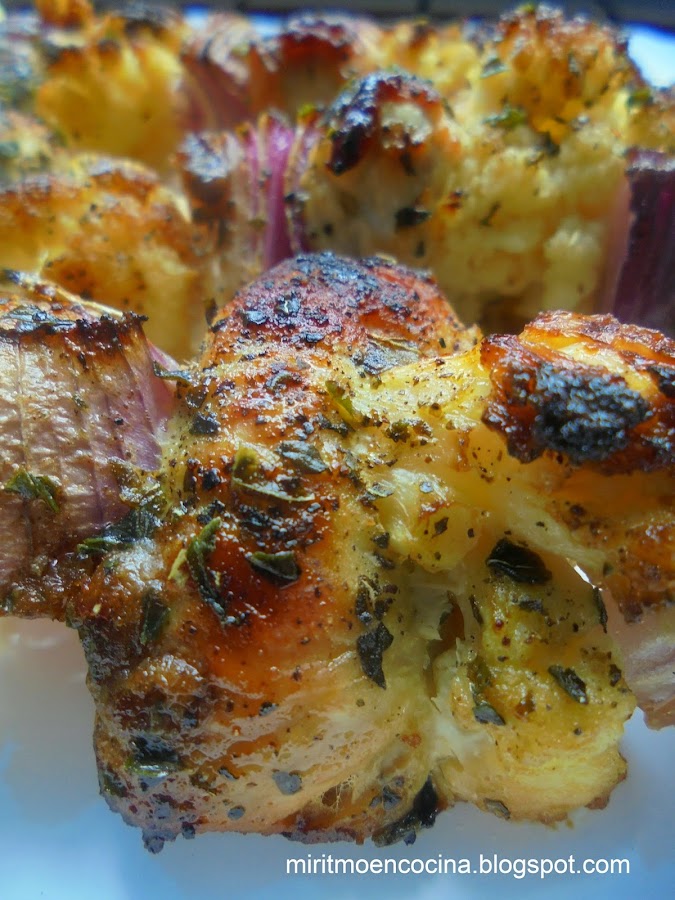 Formamos los pinchos intercambiando el pavo, el coliflor y la cebolla. Posicionamos en una bandeja de horno y agregamos una cucharada de aceite.