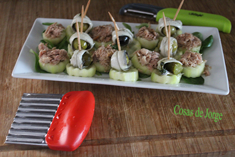 Pelamos el pepino y cortamos a rodajas con el aparatico de cortarlo en ondas, así se nos aguantara mejor el atún sobre la rebanada.
