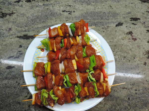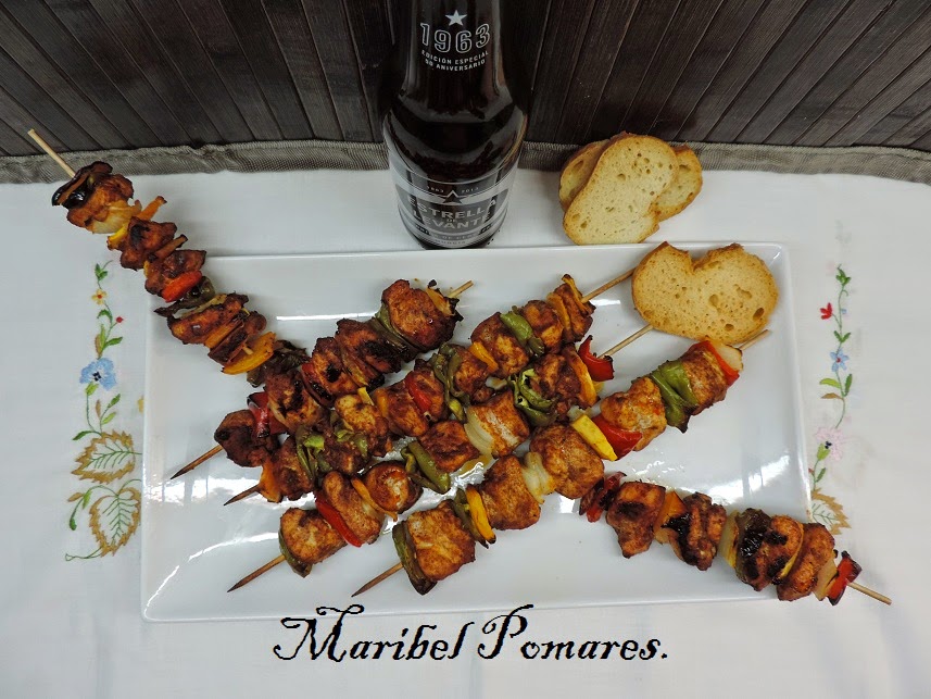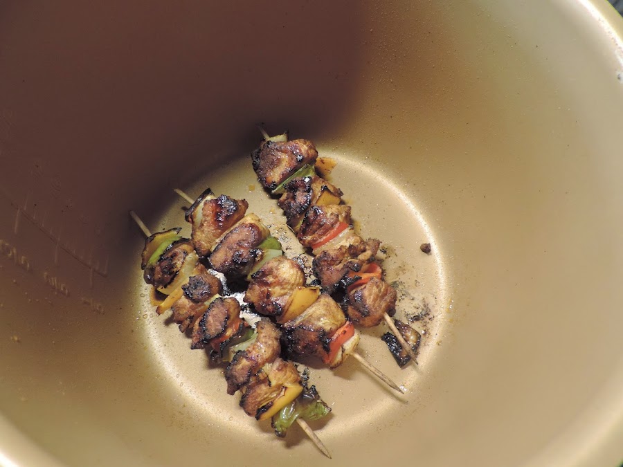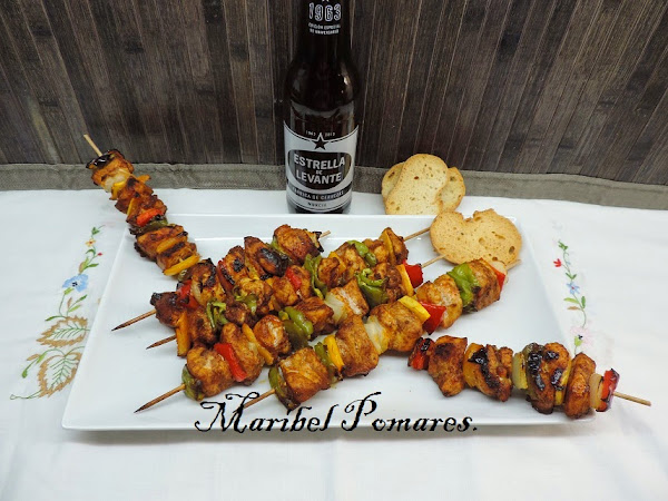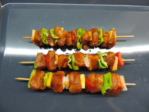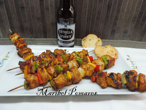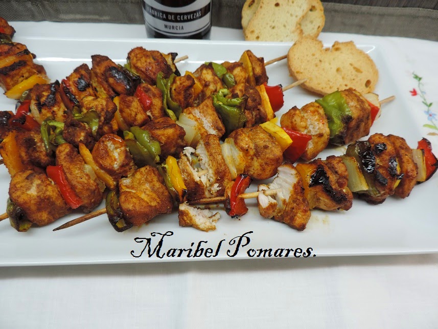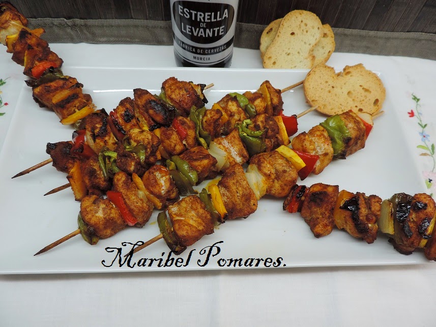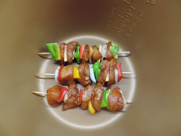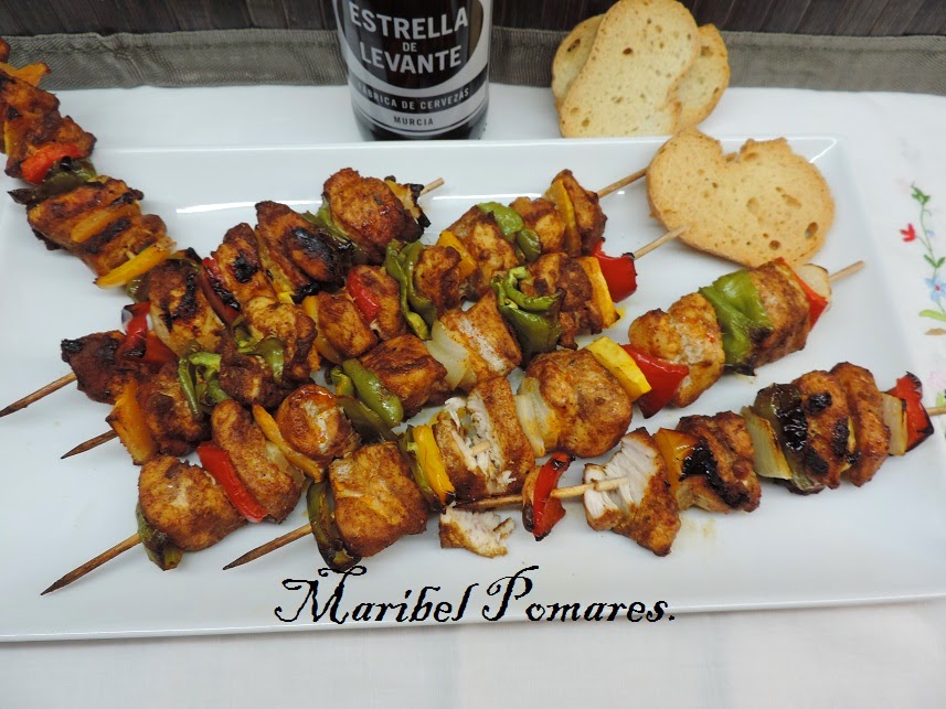 Vamos pinchando trozos de verduras y carne de forma intercalada.