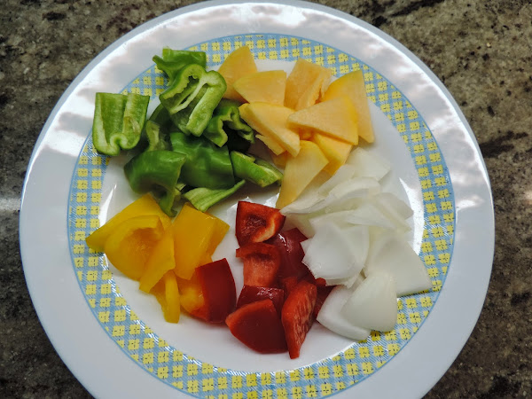 Cortamos los pimientos, cebolla, calabaza en trozos.