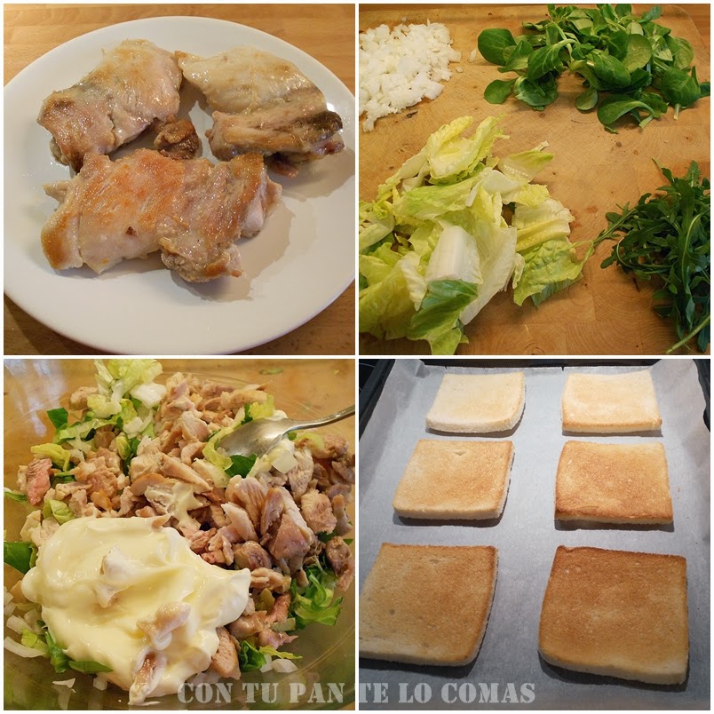 4. Tostamos las rebanadas de pan de molde, luego las cortamos por la mitad y las untamos con la mezcla de pollo.