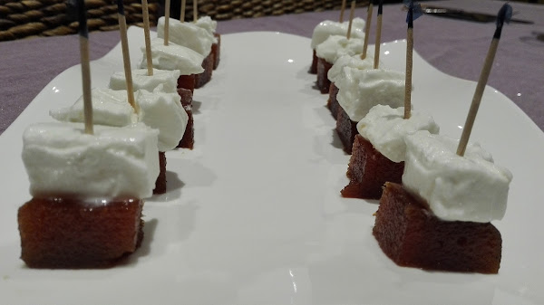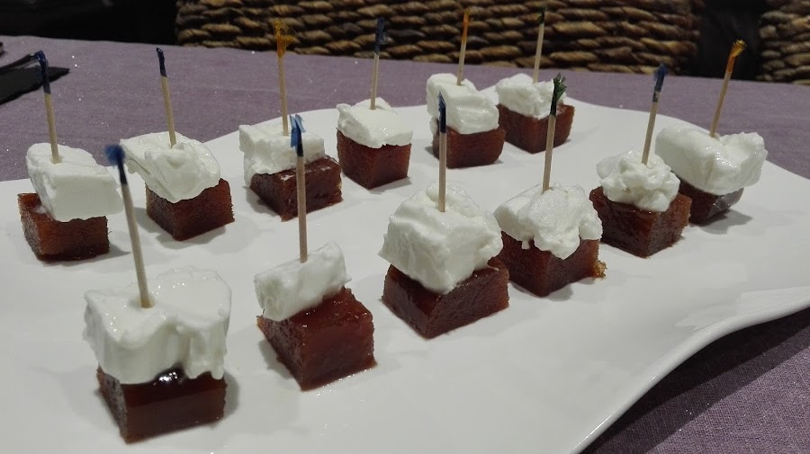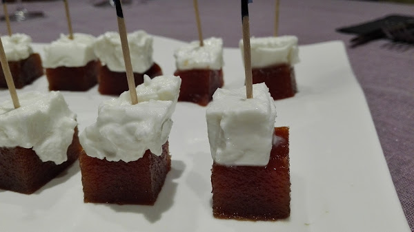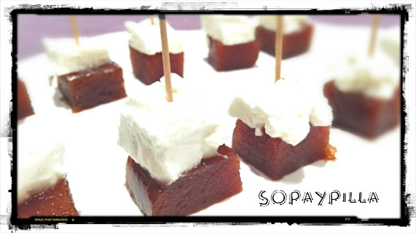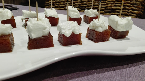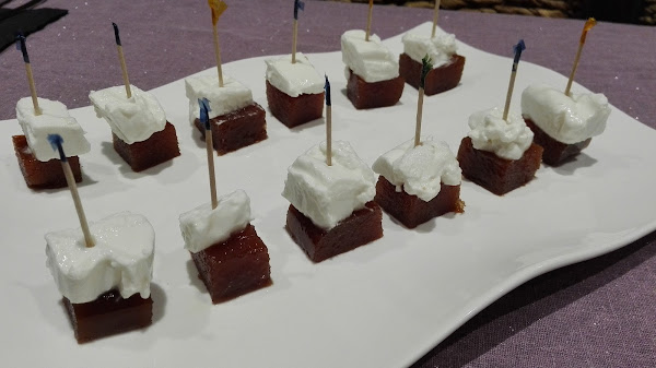 - Tal cual se ve en la foto: cortar el membrillo en cuadraditos, colocar un trozo de requesón encima y pinchar con un palillo. Esolvorear la especia que más nos guste.