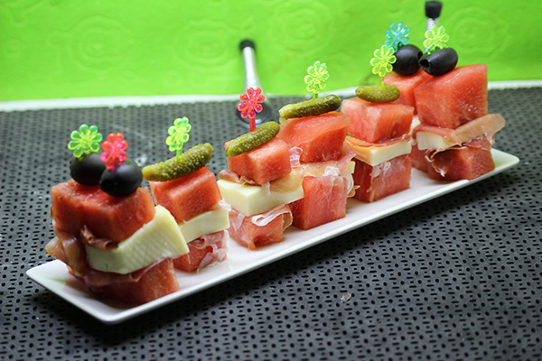 Solo nos resta montar las banderillas o pinchos, colocamos sobre la tabla un dadito de sandía, doblamos sobre ella un trocito de jamón, cubrimos el jamón con el queso, colocamos otro trocito de jamón dobladito sobre el queso y culminamos insertando una aceituna en un palillo y pinchamos este sobre todo el montadito que hemos preparado.