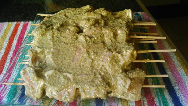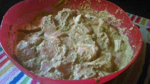 Preparamos la salsa triturando todos los ingredientes, dividimos en dos mitades, una la reservamos y con la otra preparamos la marinada, agregándole una cucharada de garam masala.