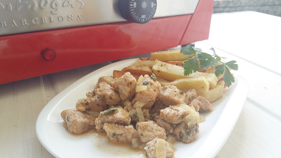 3. Calentamos la plancha Simogas Rainbow Electric a unos 200ºC. Cuando esté caliente, repartimos la carne por la superficie de la plancha, y vertemos toda la marinada por encima. Le vamos dando la vuelta a los trocitos de carne, para que se doren por todos lados.