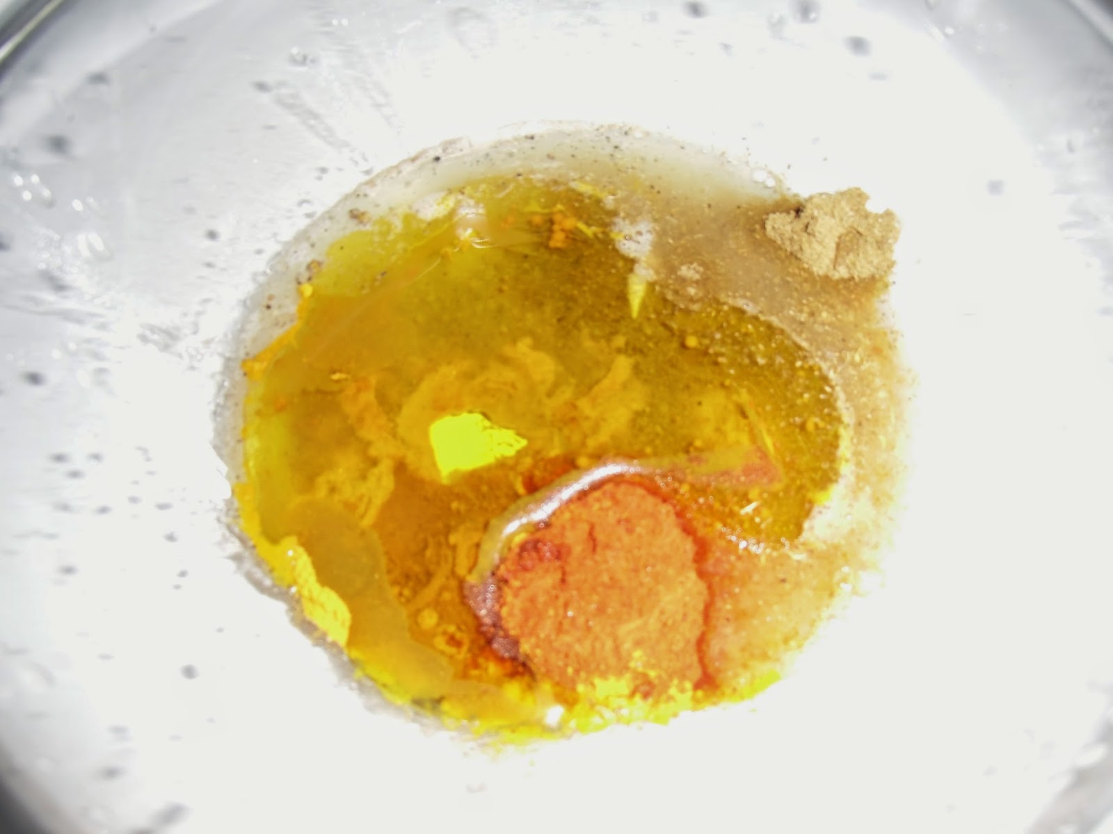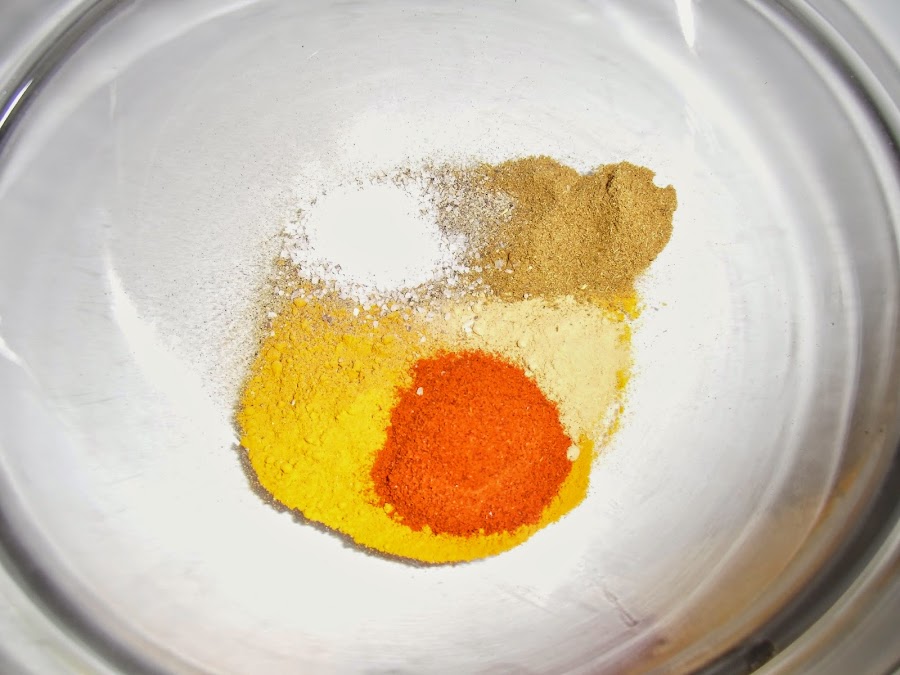 En un bol agregamos 4 cucharadas de cúrcuma, 2 de comino molido, 1 cucharadita de pimienta, 1 cucharada de sal, 1 cucharadita de jengibre y 1 cucharada de pimentón