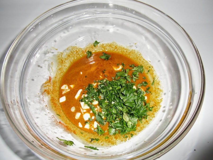 Seguidamente añadimos los dientes de ajo picado, un poco de perejil y otro poco de cilantro, todo bien picado