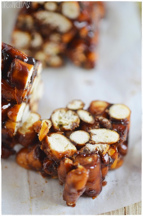 En un cazo llevamos a hervir por unos 10 minutos la miel, a fuego bajo y con cuidado de que no se derrame. Tiene que tener aspecto de caramelo. Vertemos encima de los rulitos espolvoreando harina y removemos para que todo quede bien empapado. Esta mezcla la depositamos dentro de un molde, apretando para que se quede la forma deseada y desmoldar con las horas