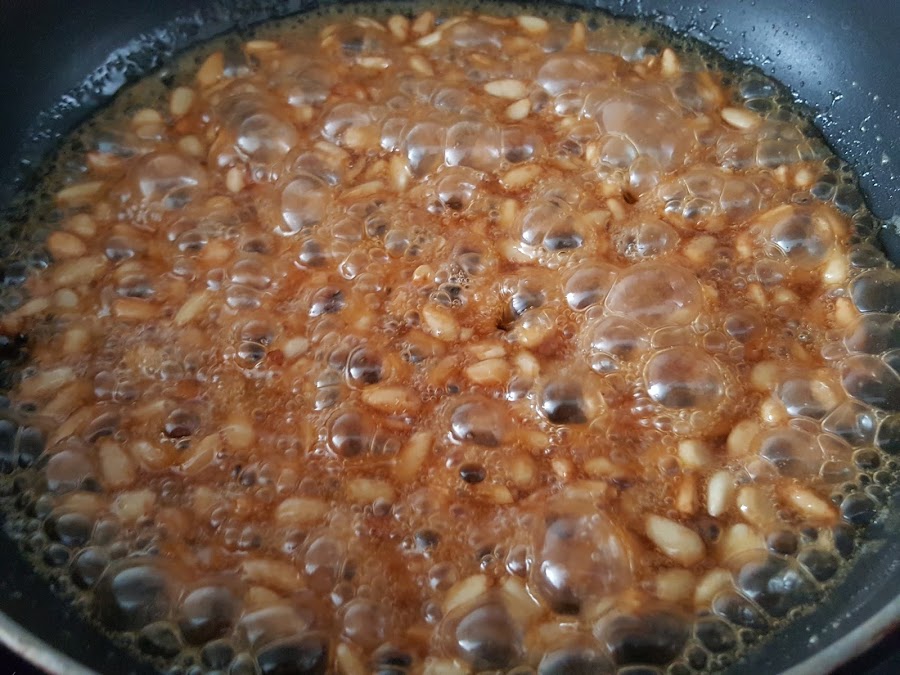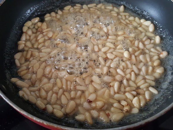 2. - Cuando lleve un par de minutos hirviendo, y veamos que empieza a hacer burbujas más grandes, añadimos los piñones.