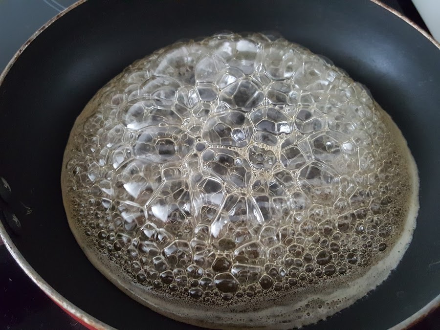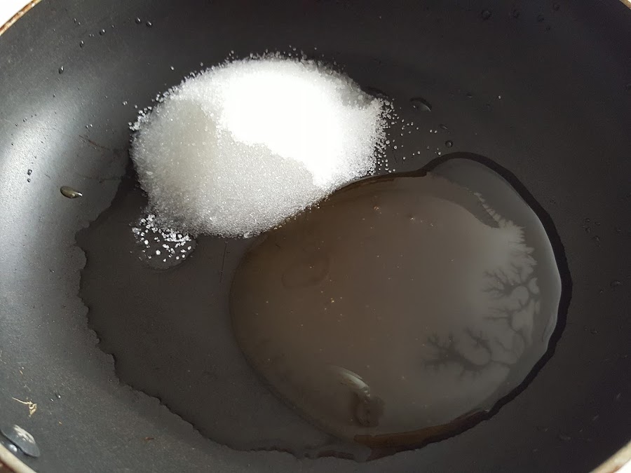 1. - Ponemos en un cazo o sartén el agua con el azúcar y la miel a fuego medio.