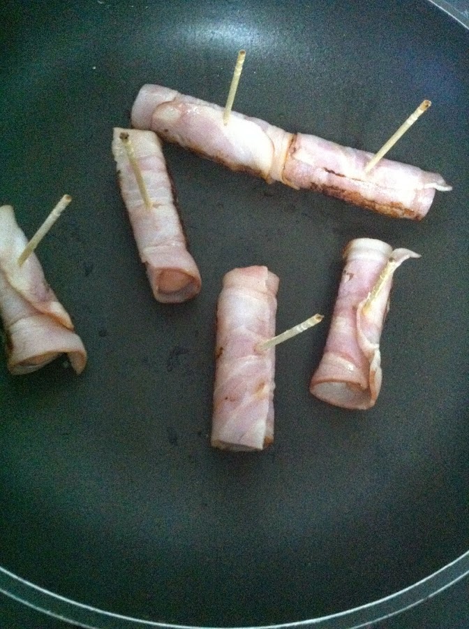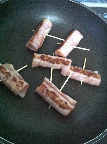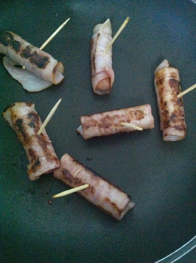 Ahora, pondremos los pintxos, en una sartén antiadherente a fuego medio para que el bacon se nos haga y se quede lo mas doradito posible por todos sus lados.