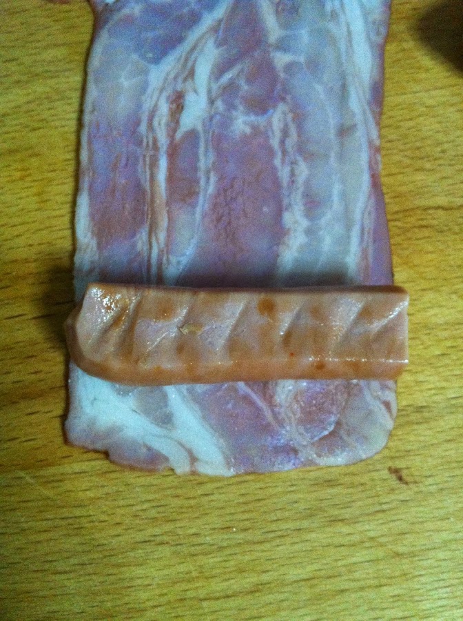 A continuación, lo único que tenemos que hacer, es envolver las salchichas con el bacon.