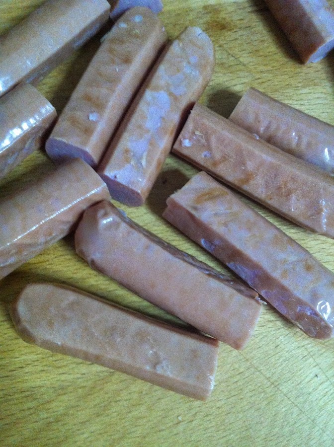 Lo primero que haremos será cortar las salchichas por la mitad.