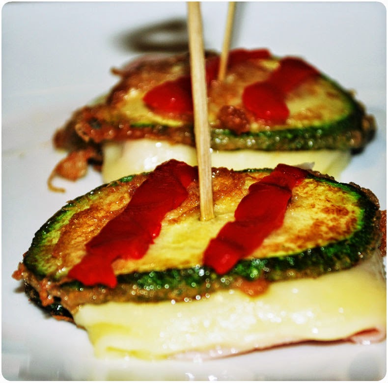 Muy muy parecidos a los milhojas de calabacín que publiqué AQUÍ, pero no iguales, ya que los de hoy no llevan harina, y también similar al pintxo de ESTA ENTRADA pero incluso el que os traigo hoy es más sencillo de "montar". el sabor, eso si, es el mismo.