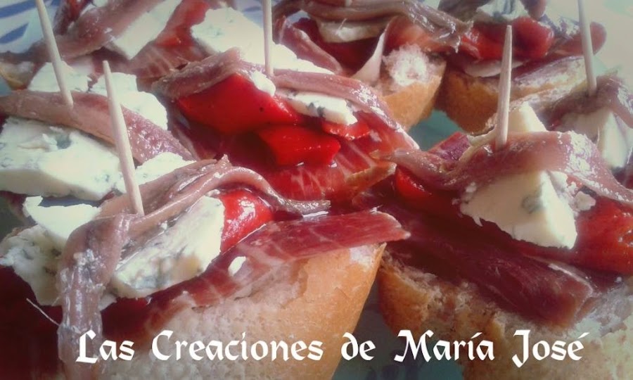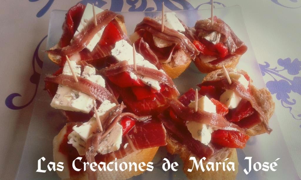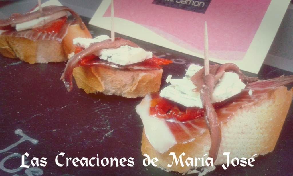 Cortamos el pan en rodajas, colocamos en este orden; jamón serrano, pimientos asado, queso francés, una anchoa y el palillo para que no se escape nada. DELICIOSOOOOO