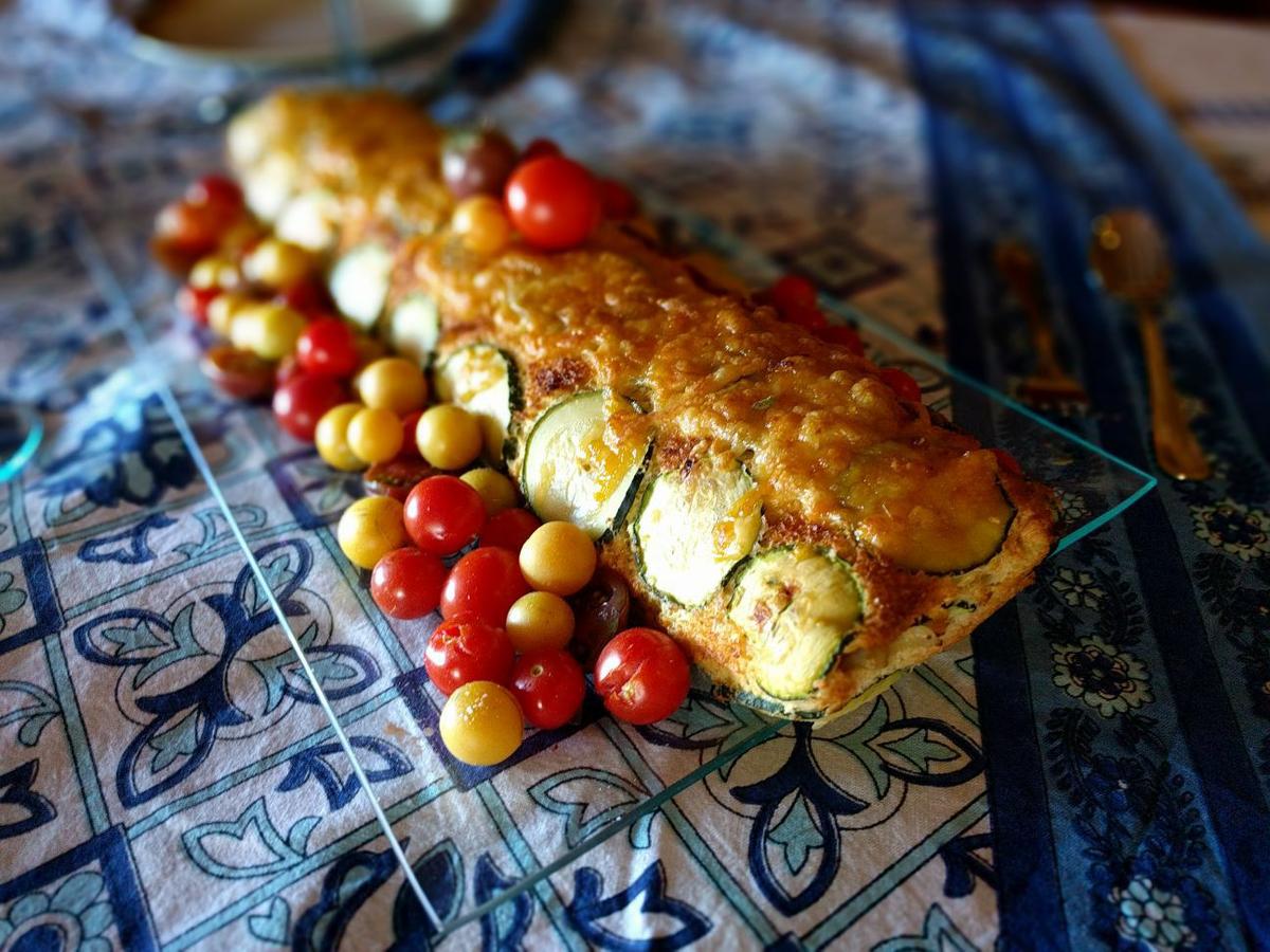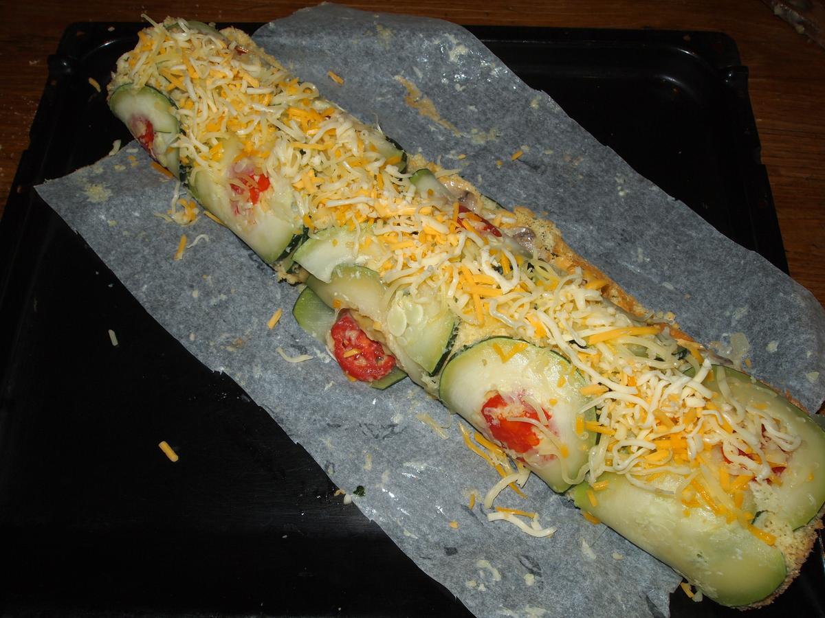 Poner papel de horno sobre una bandeja de horno y extender las rodajas de calabacín, (opcional poner también rodajas de tomate), luego extender la masa por encima.