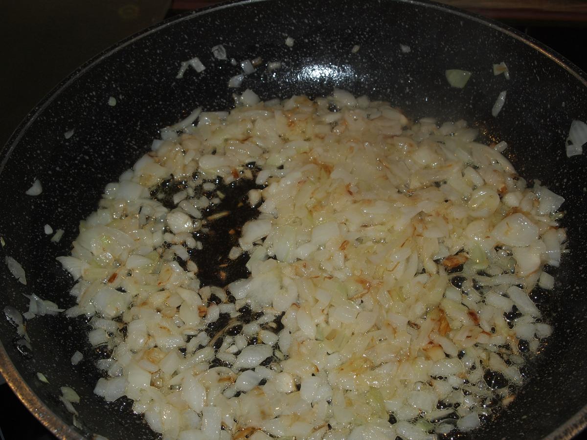 Sofreír la cebolla en una amplia sartén con el aceite y la mantequilla.
