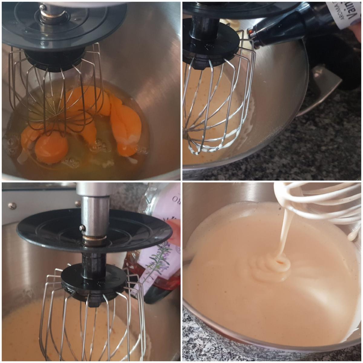 Tiempo necesario: 1 hora.Precalentamos el horno Lo primero que haremos es poner a precalentar el horno a 180ºC. En el bol de la batidora introducimos los huevos, y comenzamos a batir a velocidad alta, cuando empiecen a espumar, añadimos el azúcar poco a poco sin parar de batir, después del azúcar añadimos la esencia de vainilla y la miel, y seguimos batiendo hasta que los huevos tripliquen su volumen y queden a punto de letra.