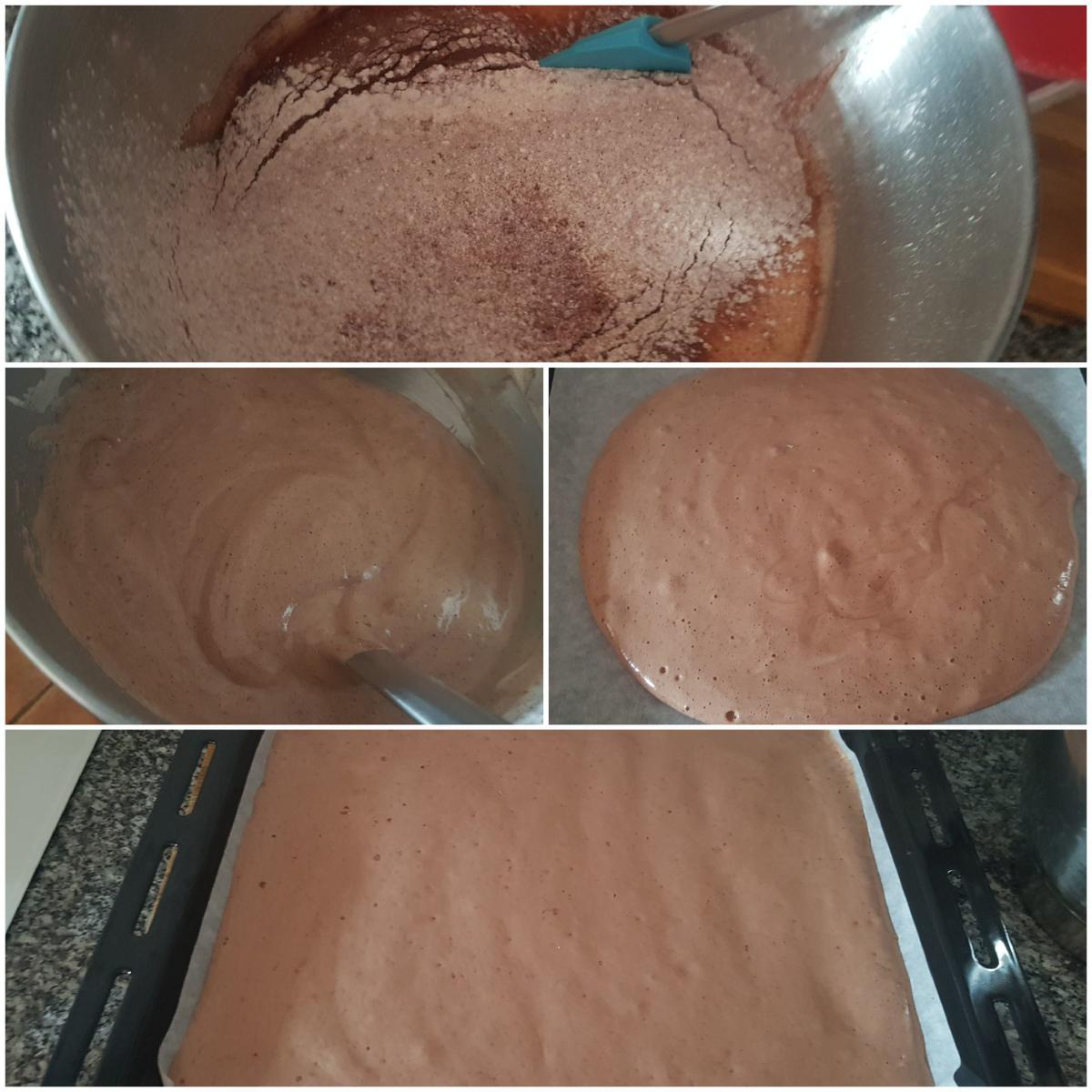 Añadir ingredientes secos Cuando tengamos batidos los huevos, en un colador ponemos la harina, el cacao y la sal y lo tamizamos en el mismo bol de los huevos. Removemos con movimientos envolventes hasta tener una mezcla homogénea y vertemos la mezcla en la bandeja, que tendremos preparada con papel de horno. Vertemos la mezcla y la acomodamos por toda la bandeja. Pegamos un par de golpes a la bandeja contra la encimera para que suban las burbujas de aire que se hayan podido formar.