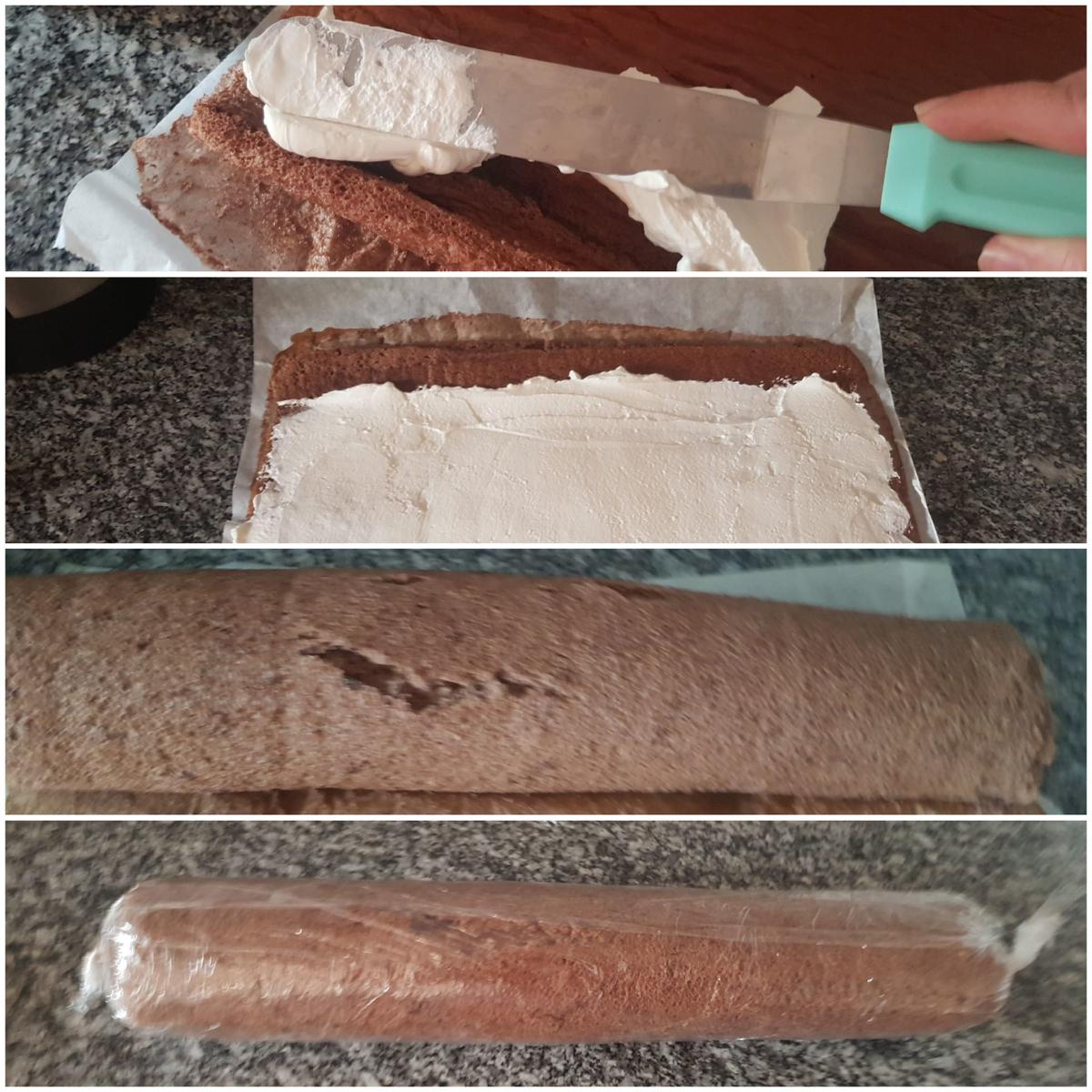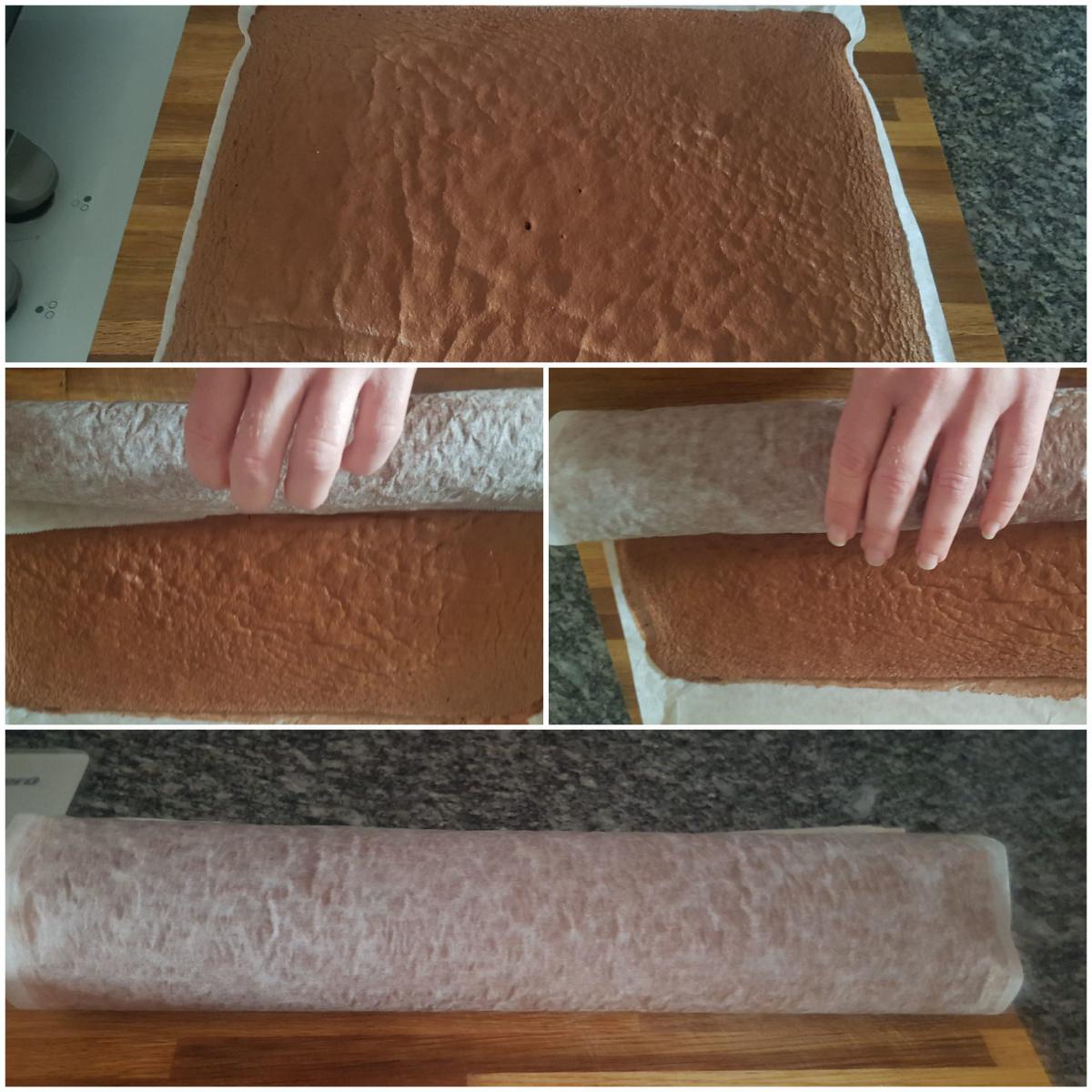 Al horno Metemos la masa del biscocho en el horno ya precalentado y horneamos a 180ºC con calor arriba y abajo durante unos 10 minutos. Cuando veáis que ya está cocido lo sacáis del horno. En caliente le haremos la forma del rollo con ayuda del papel de horno. Enrollarlo en caliente nos ayudará a que no se rompa y que al enfriarse mantenga la forma. Dejamos enfriar por completo.
