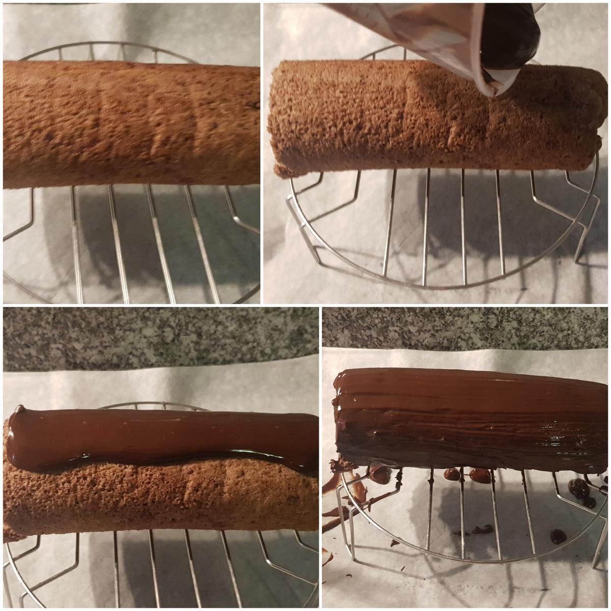 La ganache Cuando hayan pasado las dos horas de reposo del bizcocho, vamos ha hacer la ganache. En un bol ponemos la nata (crema de leche), la mantequilla y el chocolate y lo llevamos al microondas en intervalos de 30 segundos. Cada 30 segundo lo sacamos del microondas, removemos y si aún no está desecho el chocolate, llevamos otra vez al microondas, así las veces que hagan falta hasta que quede el chocolate derretido. Dejamos que enfríe 4-5 minutos para que espese un poco más y vertemos encima del bizcocho. Vamos emparejando los lados con ayuda de un pincel o espátula hasta cubrir por completo el pionono, y dejamos reposar como mínimo una hora antes de meterlo en la nevera.