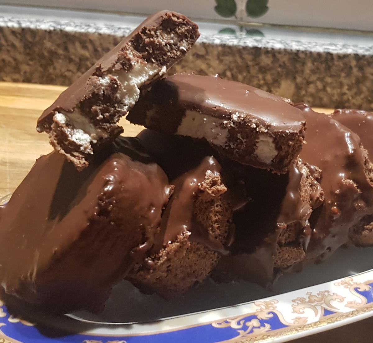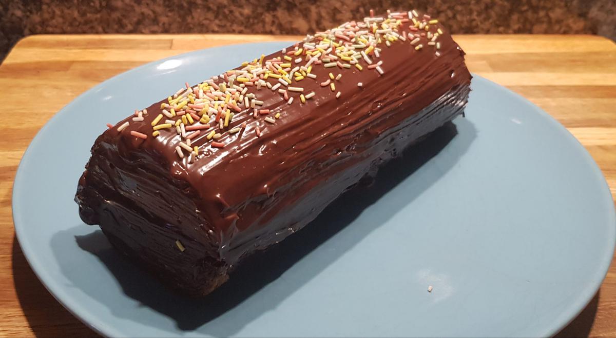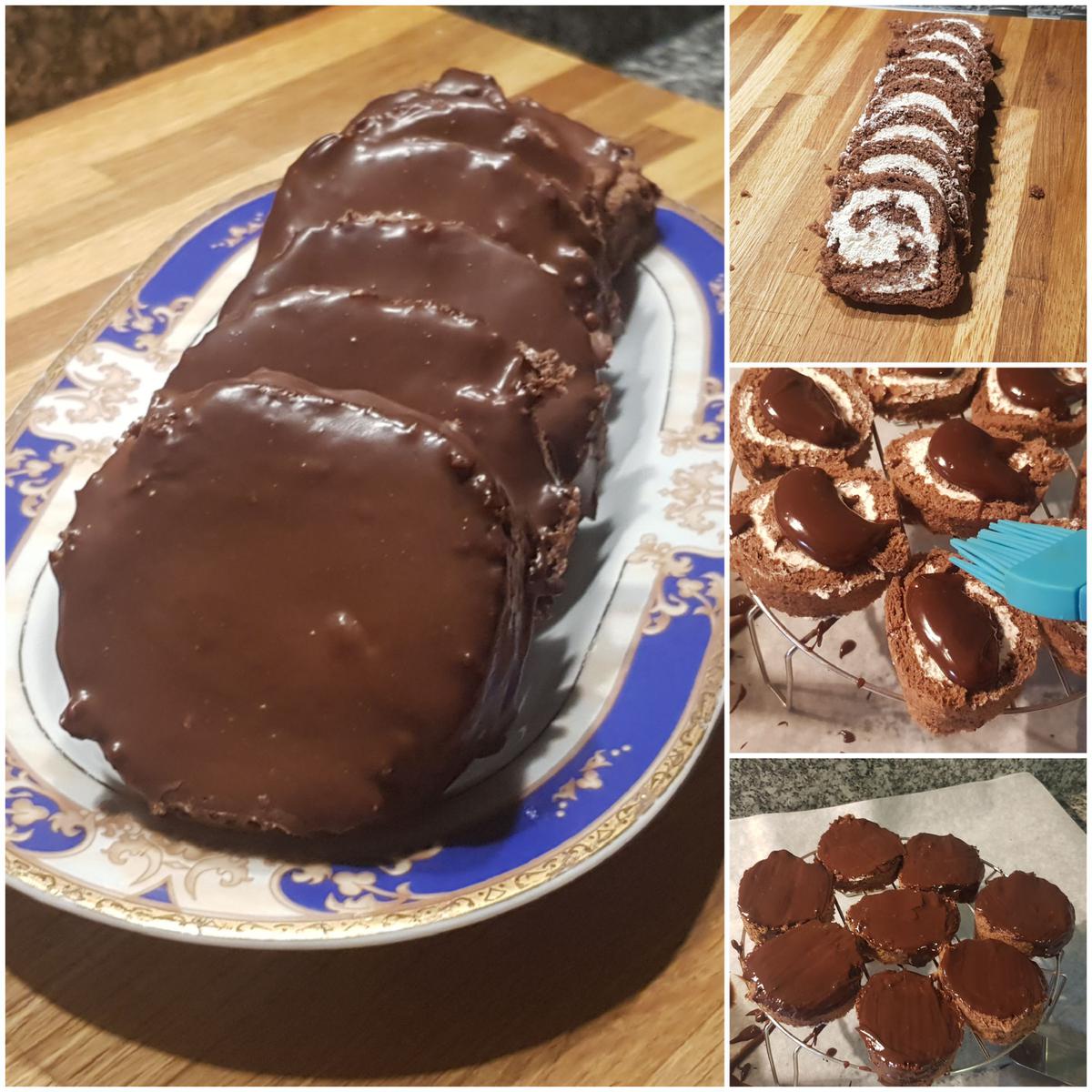 Para mí parecer quedaba un Pionono realmente grande así que lo partí por la mitad. Una mitad hice el pionono y con el resto hice Chapelas como se llaman por aquí o Fosquitos. Con un cuchillo de sierra corté rodajas de un dedo de anchas y le puse la ganache por encima y así quedan estupendos también preparadosOs dejo foticos: