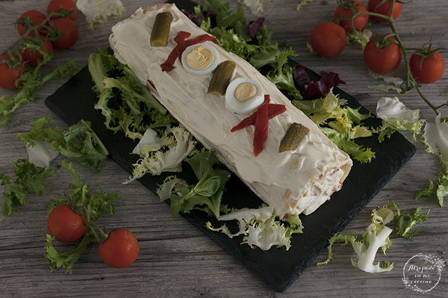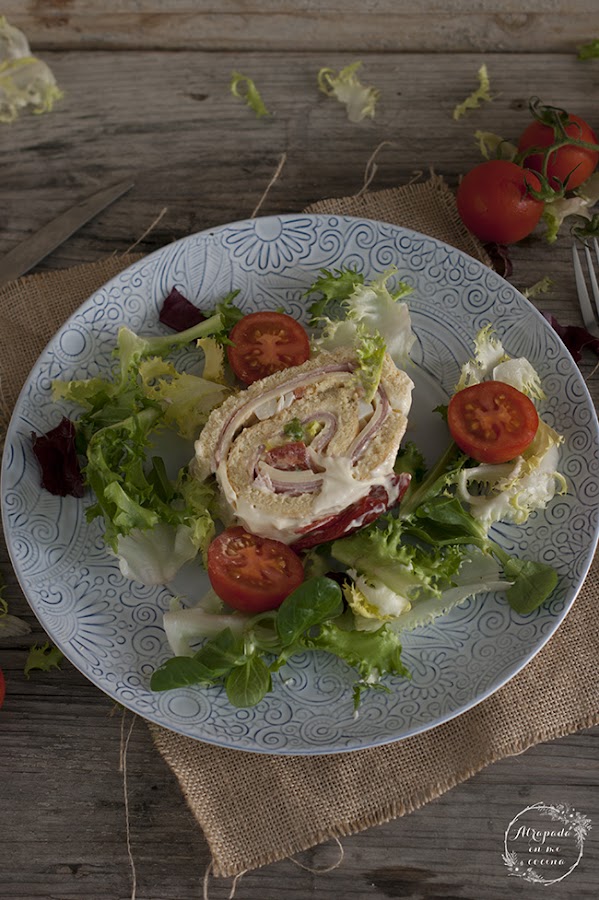 Cuando esté totalmente frío desenrollamos el bizcocho y untamos con una capa de mayonesa , extendemos encima unas lonchas de jamón york y encima las lonchas de queso. Preparamos el relleno en un bol, cortando el tomate en trocitos, la lechuga, los huevos cocidos picados, un poco de sal y tres cucharadas de mayonesa. Extendemos la mezcla sobre el bizcocho, dejando los extremos sin relleno. Volvemos a enrollar de nuevo el bizcocho con la ayuda del papel, presionando bien. Introducimos después en la nevera para que se enfríe. Unas horas después sacamos, cubrimos con una capa de mayonesa y decoramos con algunas rodajas de huevo cocido, con pimientos morrones y pepinillos en vinagre.