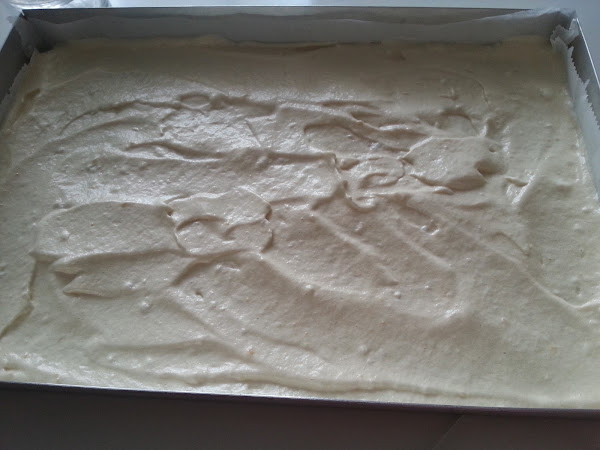 7. - Le agregamos el resto de merengue y mezclamos con mimo, para que no se bajen las claras. Y lo volcamos en una fuente forrada con papel de horno y engrasada.