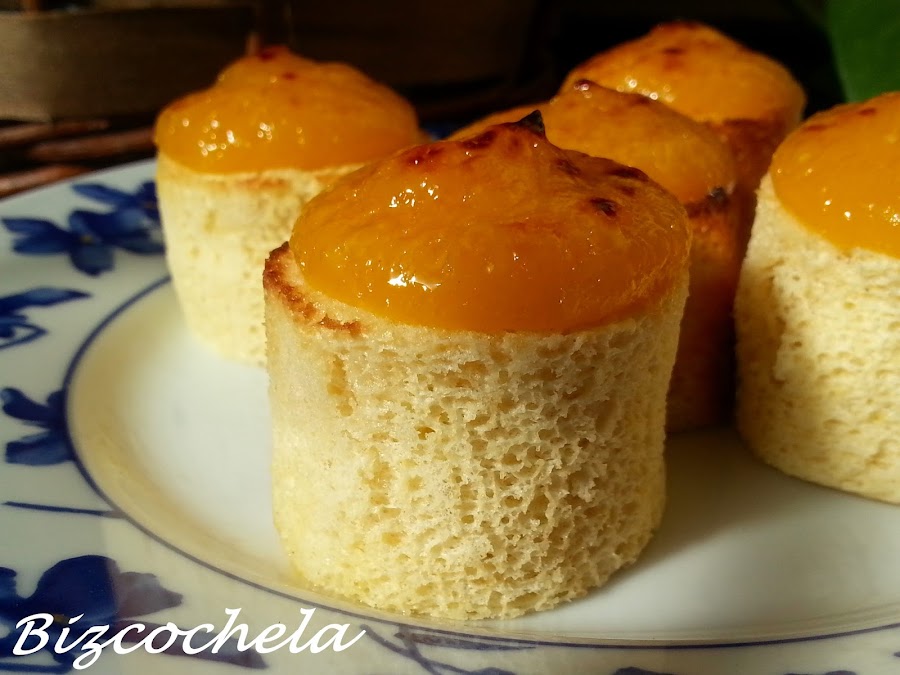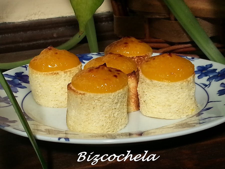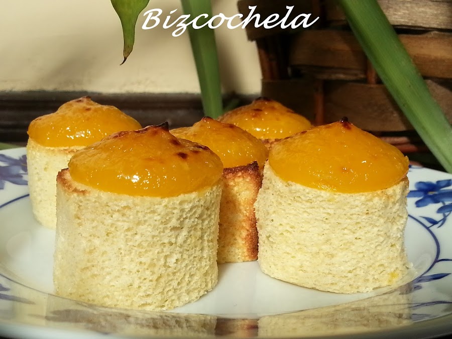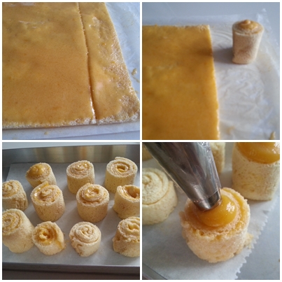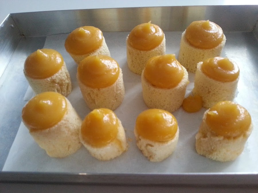 14. - Metemos la crema de yema en una manga con boquilla lisa y les ponemos encima de cada uno el "sombrerito" de crema.