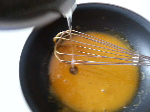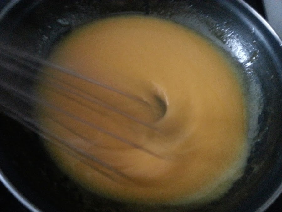 3. - Una vez frío el almíbar, se lo vamos añadiendo a las yemas, mientras batimos con unas varillas, y lo ponemos al fuego, removiendo , hasta que espese, debe quedar como una crema pastelera, y apartamos.