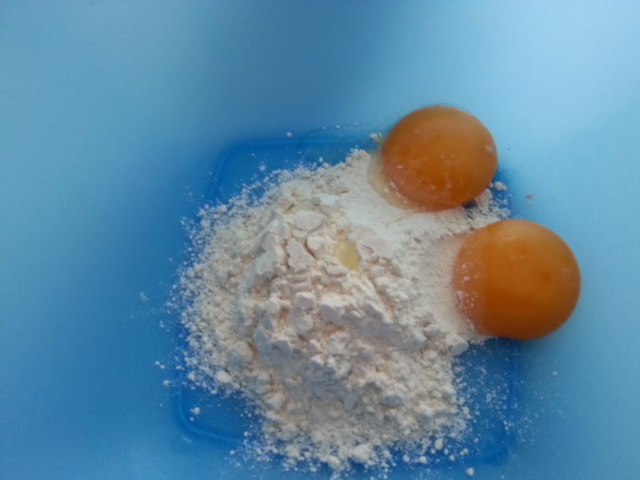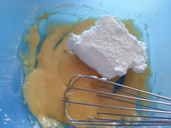 6. - Mezclamos en un bol las yemas con la harina y la leche y le agregamos una cucharada del merengue, para mezclarlo bien.