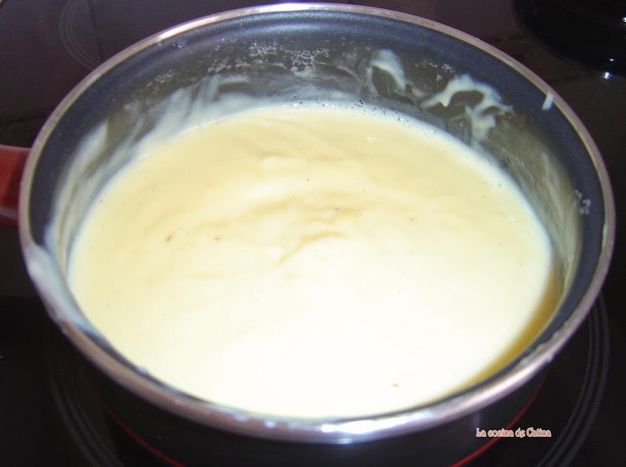 En un cazo ponemos a hervir la leche con el azúcar, la piel del limón y la vainilla. Cuando empieza a hervir apagamos el fuego y la dejamos enfriar. Una vez fría, la ponemos en un cazo, le añadimos la maicena y las yemas de huevo, mezclamos bien con las varillas y ponemos al fuego sin dejar de remover con las varillas hasta que la crema empiece a espesar. (Una vez que se han cubierto los bizcochos con una capa de crema pastelera, guardar el resto en una manga pastelera en el frigorífico).