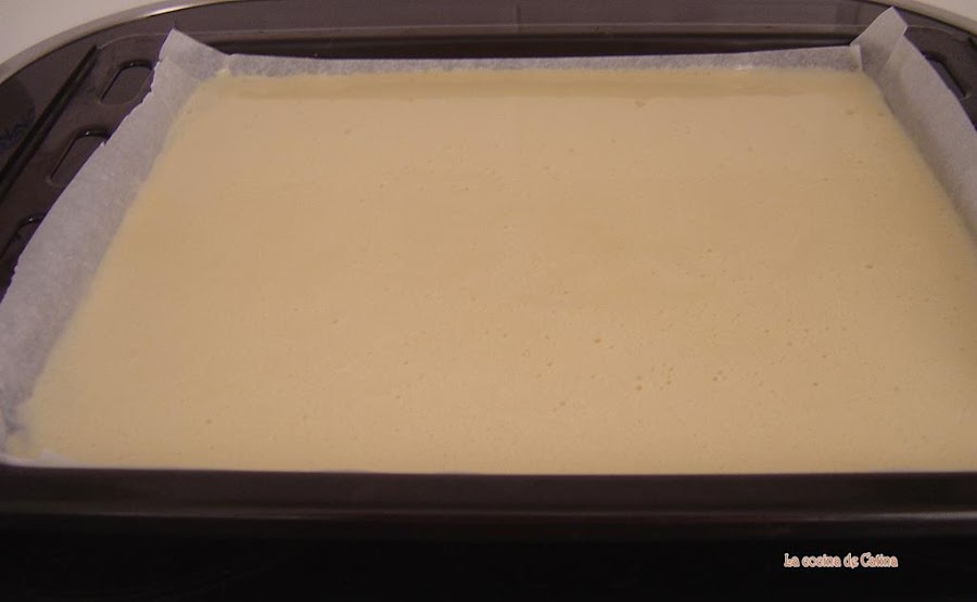 Preparación del bizcocho:Poner en un bol los huevos y el azúcar, batir con varillas eléctricas durante 6 minutos, hasta conseguir una mezcla cremosa. Añadir la harina, la pizca de sal y el azúcar avainillado. Mezclar con movimientos envolventes de fuera hacia dentro hasta que se integren todos los ingredientes. Verter en una bandeja (de 33X37), cubierta con papel vegetal la mezcla y extenderla por toda la superficie con una espátula y meter al horno precalentado a 170 grados durante 8 minutos. Sacar la bandeja del horno y dejar enfriar.